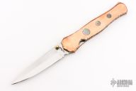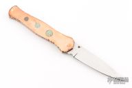 This knife by Cool-Dragon features a mirror polished blade with fileworked spine and a single brass thumbstud. The handle has fileworked copper scales with black lip pearl inlays, fileworked stainless steel liners and backspacer. Nice detent, blade seating and lockup. Has a few light scratches, otherwise excellent condition.