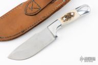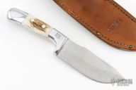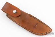 This 28CD skinner by Ruana has a satin finished blade with notched thumbrest, .175" blade stock and 1.564" blade depth, hidden tang construction. The handle has a cast aluminum handle with elk inserts. Comes with leather sheath. Excellent Condition.