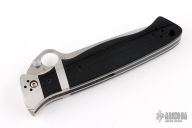 This Vallotton Sub-Hilt by Spyderco features a satin finished blade with a thumbhole, dual thumbstuds, and notched thumbrest. The handle has stainless steel bolsters, black G-10 scales, stainless steel liners, black G-10 backspacer, Clip is missing. Nice detent, lockup and blade seating. Comes with a zippered case. Has a couple light scratches, otherwise excellent condition.