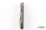 This SNG framelock folder by Mick Strider features a drop point blade with a "Battleship" finish, notched thumbrest and a thumbhole. The handle has a gunner grip grey G-10 and "Battleship" titanium frame with matching tip up titanium clip. Includes Hinderer "Lock Bar Stabilizer" for maximum reverse lock retention. Nice detent, lockup and blade seating. Excellent condition.