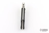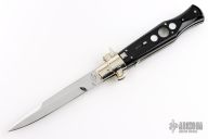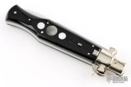 AGA Campolin 11" Blackwidow with Buffalo horn that has mother of pearl inlays. This Campolin made automatic knife has solid nickel silver bolsters with maltese cross in the hilt. To close this one you use the lock back release at rear of the handle. This makes for very tight and stable construction and it's a bit more robust because of that. Has a mirror polished blade with false top edge and fileworked spine. The nickel silver liners and a fileworked stainless steel backspacer. Includes a black leather sheath. Excellent Condition.