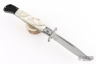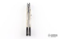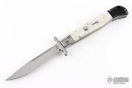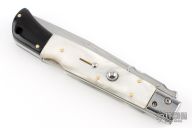 This Swing Guard Lockback Auto by AKC Italy has a polished stainless steel blade with fullers. The handle has pearlex scales with stainless steel bolsters, dymondwood rear bolsters, stainless steel liners, and stainless steel back spacer and lock.  This knife has been professionally tuned and polished by Greg's Effects.  Includes a leather sheath. Excellent Condition.