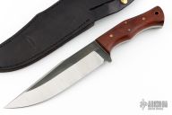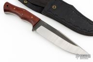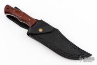 The Bowie by Gray Wolf Knives features a satin finished blade with black flats, full tang construction, .187" blade stock and 1.648" blade depth. The handle has ironwood scales with copper pins and white liners. Comes with a hand tooled black leather sheath. The knife is in excellent condition.