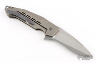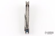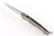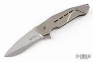 This Reduced Styx by GTC Knives features a two-tone recurve blade with flipper. The handle has a bead blasted titanium frame with a Damascus tip up clip. Dated 2015. Nice detent, lockup and blade seating. Excellent condition.