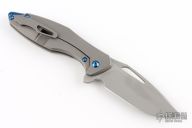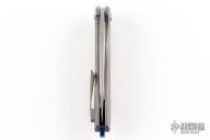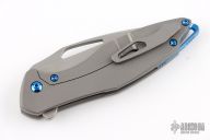 This Mini Arius by Koenig knives features a Burnished w/ PF finished blade with thumbhole and flipper. The handle has a bead blasted titanium frame with pattern milling, a titanium tip up clip, anodized titanium backspacer and hardware. Has ceramic bearings and a ceramic detent ball. Nice detent, lockup and blade seating. Comes with original box and COA April 22, 2024. Excellent Condition.