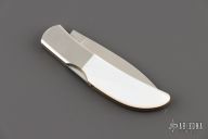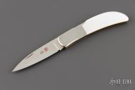 This knife features a satin finished blade with nail nick. The handle has stainless steel bolsters, mother-of-pearl scales, brass liners, and a stainless steel backspacer. Comes with brown leather slip sheath. Has some light scratches, otherwise excellent condition.