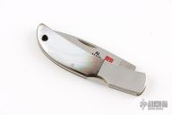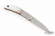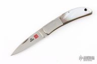 This knife features a satin finished blade with nail nick. The handle has stainless steel bolsters, mother-of-pearl scales, brass liners, and a stainless steel backspacer. Comes with brown leather slip sheath. Has some light scratches, otherwise excellent condition.