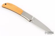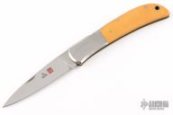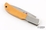 This Falcon Talon by Al Mar features a mirror finished blade with nail nick. The handle has stainless steel bolsters, yellow paper micarta scales, brass liners, stainless steel backspacer. Has a few light scratches, otherwise excellent condition.