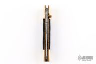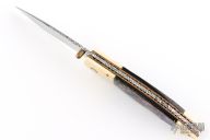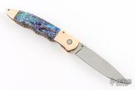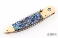 This knife by Cool-Dragon features a mirror polished blade with fileworked spine and a single brass thumbstud. The handle has mammoth ivory bolsters, abalone scales, fileworked copper liners and stainless steel backspacer. Nice detent and blade seating. Has some blade play, otherwise good condition.