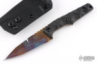 This Huginn EDC by Bawidamann Blades was named after Odin’s Raven. It features an acid etch with patina finished blade with notched thumbrest and sharpened top edge, .1" blade stock and 1.200" blade depth, full tang construction. The handle has IM Bawidamann Chunked Pattern Carbon Fiber scales (proprietary Carbon fiber composite). Comes ready to carry with the Bawidamann Uberscabbard. Excellent condition.