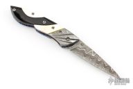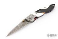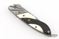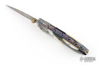This linerlock folder by OH Design features a Damascus blade with a fileworked spine and a single brass thumbstud. The handle has fluted Damascus bolsters, front and rear, mother of pearl and buffalo horn scales, anodized and fileworked titanium liners and backspacer. Nice detent and lockup. Has a spot on the blade, otherwise excellent condition.