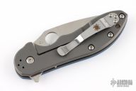 This Domino Flipper has a satin finished stainless steel drop/spear point blade with thumbhole and notched thumbrest. Handle is stonewashed titanium with A-side blue G-10 overlay, 4-way anodize finish reversible deep carry clip, and lanyard tube pin. Action is extremely responsive with great lockup. Comes with original box and papers. Excellent condition.
