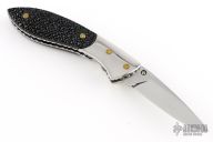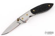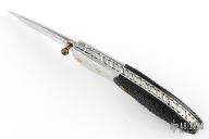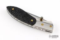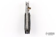 This linerlock by OH Design features a mirror finished blade with single thumb stud with an abalone inlay and a fileworked spine. The handle has stainless steel bolsters, Komodo dragon skin scales, fileworked stainless steel liners and backspacer. Nice lockup and blade seating. Has some light scratches, otherwise excellent condition.