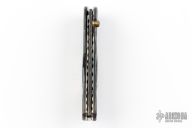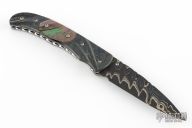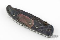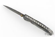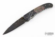 This linerlock by OH Design features a Damascus blade with single brass thumb stud with a black inlay and a fileworked spine. The handle has carved Damascus bolsters, black lip pearl scales, fileworked stainless steel liners and backspacer. Nice detent, lockup and blade seating. Excellent condition.