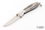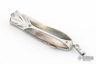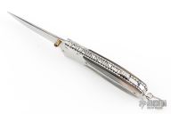 This linerlock by OH Design features a mirror finished blade with single thumb stud with a black lip pearl inlay and a fileworked spine. The handle has fluted stainless steel scales with black lip pearl inlays, fileworked stainless steel liners and backspacer. Nice lockup and blade seating. Has a couple light scratches, otherwise excellent condition.
