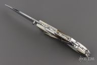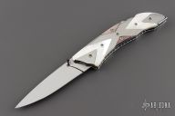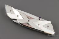 This linerlock by OH Design features a mirror finished blade with single thumb stud with a purple stone inlay and a fileworked spine. The handle has stainless steel, mother of pearl and black lip pearl scales, fileworked stainless steel liners and backspacer. Nice lockup and blade seating. Excellent condition.