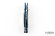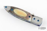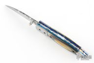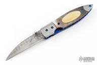 This linerlock by OH Design features a Damascus blade with single thumb stud with a mother of pearl inlay. The handle has Damascus bolsters, black lip pearl scales with gold lip pearl inlays, fileworked and anodized titanium liners and a fileworked stainless steel backspacer with mother of pearl inlays. Nice detent and lockup. Excellent condition.