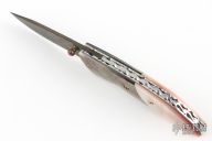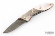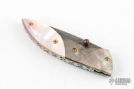 This linerlock by OH Design features a Damascus blade with single brass thumb stud with a pink stone inlay. The handle has black lip pearl bolsters, mother of pearl scales, fileworked stainless steel liners and backspacer. Nice detent, lockup and blade seating. Excellent condition.