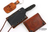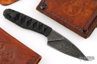 This Drop Point Neck Knife by Brad Mock features an acid etched blade with .122" blade stock, 1.019" blade depth with hidden tang construction. The handle has a wrapped handle over black frog skin. Comes with a Kydex sheath/leather sheath with paracord leather slip and COA. Excellent condition.