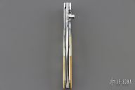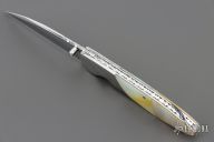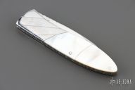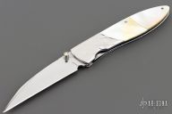 This linerlock by OH Design features a mirror polished blade with single thumb stud with gold lip pearl inlay. The handle has fluted stainless steel bolsters, gold lip pearl scales, fileworked stainless steel liners and backspacer. Nice detent and blade seating. Has a little blade play, otherwise excellent condition.