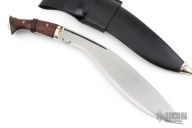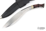 This Great Gurkha Khukri Mark 1 by G.G.K. features a satin finished blade with fullers, .348" blade stock and 2.497" blade depth, full tapered tang construction. The handle has a nickel silver guard, rosewood grip and nickel silver butt. Comes with a black leather sheath. Has some light scratches, otherwise excellent condition.