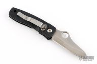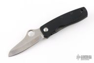 This Bob Terzuola designed knife by Spyderco has a satin finish blade with thumbhole. The handle has black aluminum scales with a single stainless steel liner and black backspacer, stainless steel clip is tip down. Vintage discontinued model. Has a couple very light scratches, otherwise excellent condition.