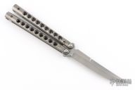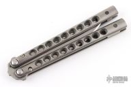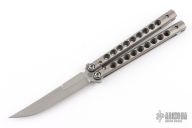 This Balisong by Biegler Blades features a stonewash finished blade with false top edge. The handles are milled titanium with titanium spacers. Comes with a zippered case. Excellent condition.