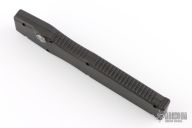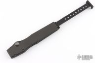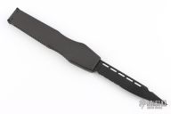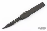 This HALO II is the clip point blade model in the HALO series by Microtech Knives. Single action, side positioned button for firing. Closure via a reverse charging handle in the rear of the frame. Contoured frame grip with milled ribbing on the frame spine and belly. This Halo II has a black clip point partially serrated blade. Dated 08/2002. Has some light scuffs, otherwise excellent condition. Comes with a nylon belt sheath.