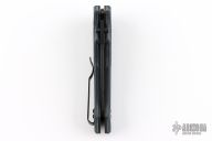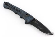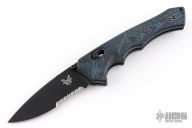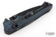 This Assisted Opening Mini-Rukus by Benchmade features a black drop point partially serrated blade with false top edge. The handle has black/blue G-10 scales over a black steel liners with a black stainless steel tip up clip. Has some light scuffs, otherwise excellent condition.