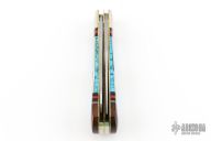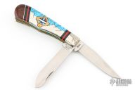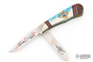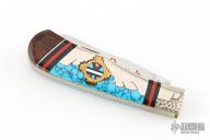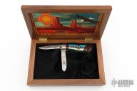 This custom slip joint by United Cutlery has a custom handle by David Yellowhorse and is from a limited edition of 600 pieces. The handle has carved nickel silver bolsters, covers made of native turquoise, spiny oyster red, coral, desert ironwood and black jet, nickel silver and brass inlays. Brass liners and stainless steel springs, has half-stops. #336 on the blade. Comes with original display box and papers. Excellent condition. Dated 1993