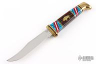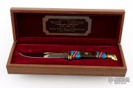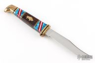 This Buck 102 custom by David Yellowhorse features a mirror polished blade, brass guard, turquoise and red jasper spacers, and an ironwood handle with a brass buffalo inlay. Includes original wood display case. Excellent condition.