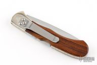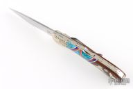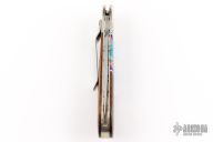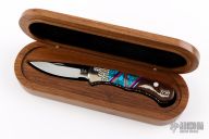 This Custom Buck Lockback has been customized by Brian Yellowhorse. It features a mirror polished blade with nail nick. The handle has carved nickel silver bolsters, ironwood scales with nickel silver, turquoise and mother of pearl inlays, tip down stainless steel clip. Comes with a wooden display box. #314 of 500. Excellent condition.