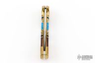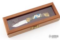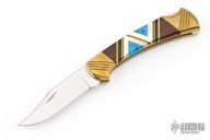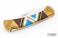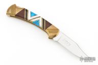 This Buck Model 112 knife Customized by David Yellowhorse. It has a mirror polished blade with nail nick. It is a lock back with brass bolsters, turquoise, ironwood, pearl and brass spacers. Strong lock up. Includes a wood display case and box. Excellent condition. Dated 1996 and S/N 0009