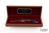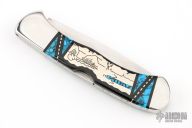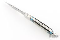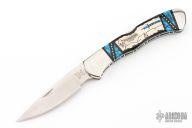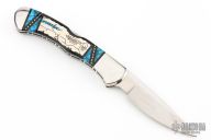 This knife by Buck Knives has been given a custom handle by David Yellowhorse. It features a satin finished blade with nail nick. The handle has a polished nickel silver frame with stone and nickel silver inlays, fileworked inner edges, stainless spring and backspacer. Comes with original wooden display case, box and plaque. Excellent condition.