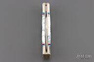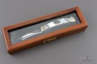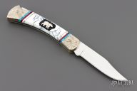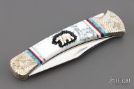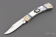 This Buck Model 110 has been customized by Brian Yellowhorse. The blade features a mirror polished clip point blade with a nail nick. The handle features a nickel silver frame with multi piece scales and an inlaid nickel silver bear. Includes original display box and papers. Excellent condition. #008/100