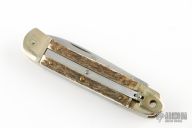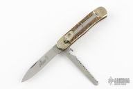 This Lever Lock Automatic by Hubertus Knives features a polished point blade and a saw blade with nail nick. The handle is comprised of nickel silver bolsters and lever with stag scales over brass liners and steel backspacer. Has some light scratches, otherwise excellent condition.