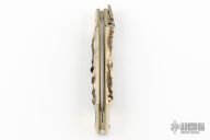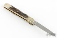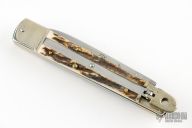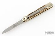This Lever Lock Automatic by Hubertus Knives features a polished drop point blade. The handle is comprised of nickel silver bolsters and lever with stag scales over brass liners and steel backspacer. Has some light scratches, otherwise excellent condition.