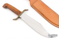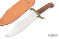 This Authentic Bowie by Western Cutlery features a mirror polished bowie blade with a sharpened top edge, .173" blade stock and 2.110" blade depth, full tang construction. The handle has a brass s-guard, wood scales with brass pins. Comes with a brown leather sheath, original box, papers and wooden display plaque. Blade stamped "WESTERN BOWIE U.S.A.". Has a few light scratches and a little patina, otherwise excellent condition.