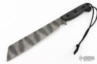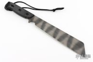 This RW3 by Strider Knives features a tiger striped parang style blade with deep choil, .199" blade stock and 2.090 blade depth, full tang construction. The handle has milled black G-10 scales. Dual lanyard holes in pommel. Has some scuffs and scratches, has been used, otherwise good condition.