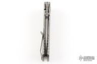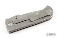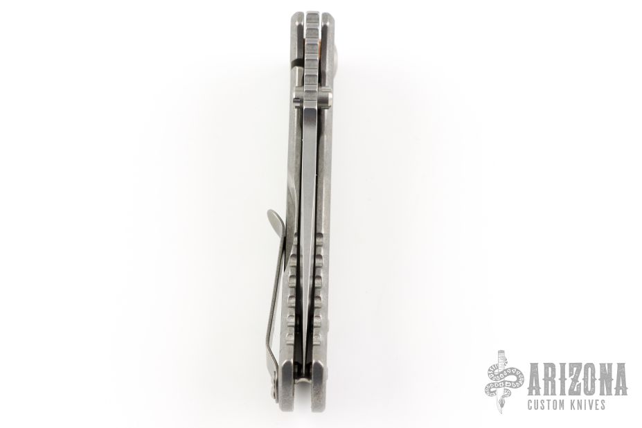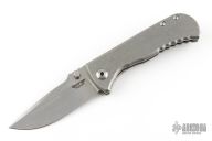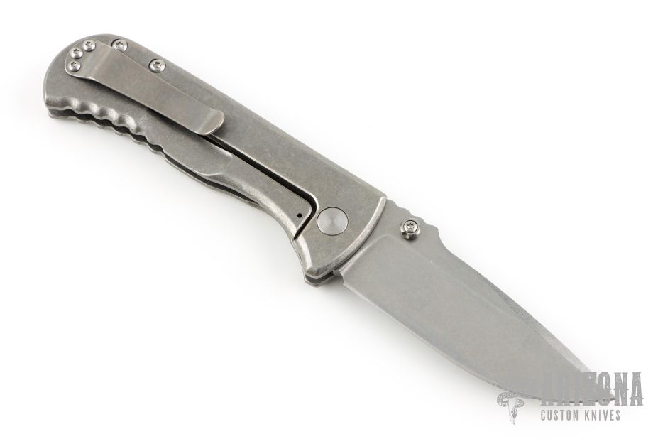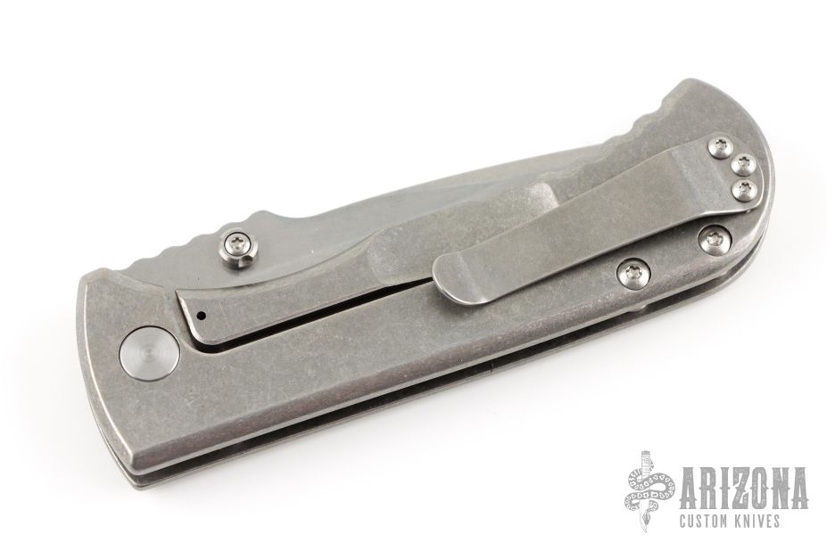 This Talos by Les George features a stonewashed blade with a false top edge, notched thumbrest and reversible dual thumbstud. The handle has a smooth stonewashed titanium with matching tip up clip. Nice detent, lockup and blade seating. Very smooth action. New condition. Comes with original zippered case.