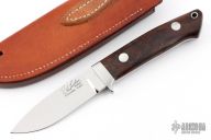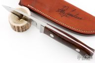 The classic that made Bob Loveless designs so famous. Mirror finished drop point blade with the "R.W. Loveless maker Riverside, Calif." logo dating it to the 1980's. Full tapered tang construction. Blade is .217" thick and .953" deep. Stainless steel guard and desert ironwood burl scales with red liners, lanyard hole. #354. Comes with matching signed leather sheath. Excellent condition.