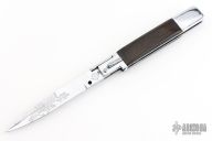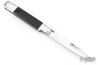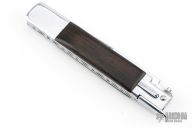This Picklock Auto by Agasi Hambartsumian of Armenian Doctor Knives features a mirror polished bayonet ground blade with a false top edge. The handle has a polished stainless steel frame with fileworked stainless steel backspacer, wood scales. New from maker. This one has be held tight to fire all the way. The maker said it should break in overtime. If you hold it tight, or with two hands, it fires properly. Just needs a little break in period.