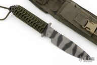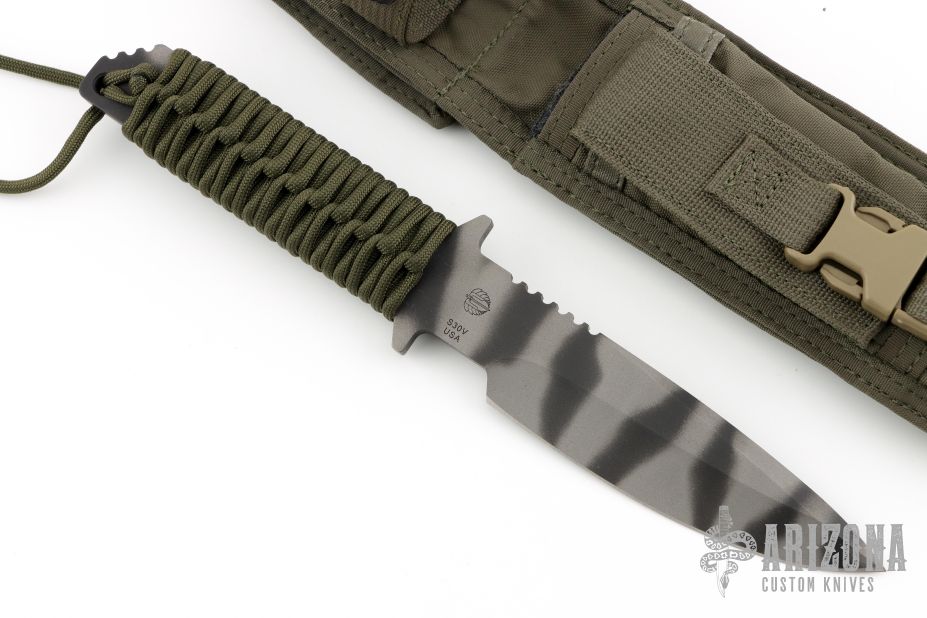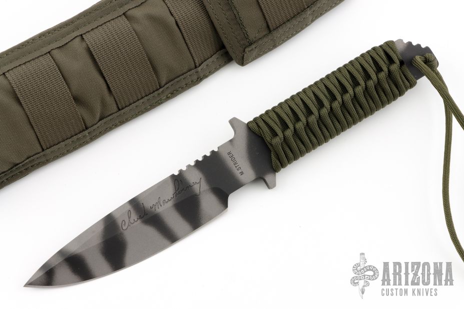 Special edition, Chuck Mawhinney "Sniper" fixed blade from Mick Strider Knives. Chuck Mawhinney served in the Vietnam War and set a record number of confirmed kills for a USMC sniper. The CPM S30V blade has flat ground edge and false top edge. The tiger striped blade is marked with a "Chuck Mawhinney" signature. Full tang construction makes this knife very solid. Handle is paracord wrapped (green) and features jimping on the blade spine for thumb. Includes heavy duty CSM Brand Nylon sheath system with felt bonded Kydex liner & accessory pouch. New condition.