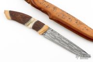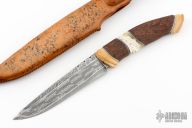 This knife titled "Duller Shade of Gloss" by Thomas Lofgren features a Henry Hilden 3-bar Mosaic Damascus blade with fileworked spine and false top edge, the blade was ground and designed by Tomas Lofgren, .175" blade stock and 1.262" blade depth, hidden tang construction. The handle is made of fossil mammoth ivory, wenge wood, muskox, black/silver spacers, has a mammoth ivory ball set in the butt. Comes with a Scandinavian style brown leather sheath and nylon zippered case. New from maker!