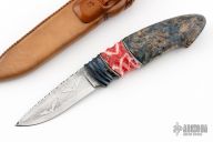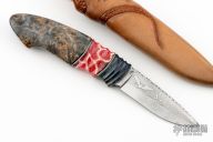 This knife titled "Red Coral" by Thomas Lofgren features a San Mai Damascus blade with etched bats, fileworked spine and false top edge, .158" blade stock and .962" blade depth, hidden tang construction. The handle has a fluted dyed maple burl wood guard, dyed and stabilized burl wood grip, and black/silver/fluted red coral spacers. Comes with a Scandinavian style brown leather sheath and nylon zippered case. New from maker!