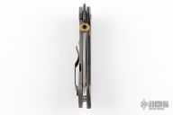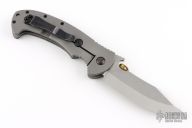 This Tiger by Emerson Knives has been converted to a framelock by Andrew Charlet. It features a stonewashed blade with a 45 Auto thumbdisc, notched thumbrest and wave feature. The handle has a green canvas micarta front scale, bead blasted titanium liner, bead blasted titanium lockside, barrel spacers and tip up black stainless steel clip. Excellent condition. S/N 0839.  Comes with original box, papers, black G-10 scales, custom green canvas micarta lockside scale, original titanium locking liner.