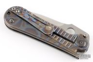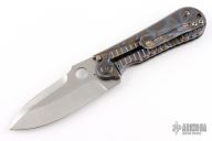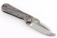 This Left Handed framelock by Steve Ryan features a satin finish spear point blade with false top edge and a thumbhole. The handle has a flamed and milled titanium frame with a light orange peel finish, matching tip up titanium clip. Nice detent, blade seating and lockup. Comes with a zippered case. Has light scuffs and scratches, good condition otherwise.