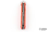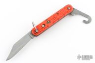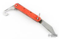 This knife by Schrade features a clip point blade. The handle has orange jigged scales, stainless steel liners and backspacer. Has Safety.  Has some blade play and scratches, has been resharpened, otherwise the knife is in good condition for its age.