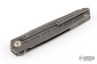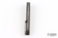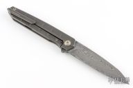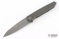 This Cypher MK3 by Deryk Munroe features a Vinland Damasteel blade with fullers, a notched thumbrest and flipper. The handle has a tumbled and milled titanium frame, titanium pivot with silver inlays, a titanium backspacer with silver inlay and lanyard hole, titanium tip up clip with silver inlay and hidden screws, and stainless steel lockface insert/internal over travel stop. Nice detent, lockup and blade seating. Rides on bearings. Comes with original box and papers dated 6/2022. Excellent condition.