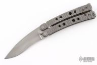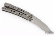 This EDC Balisong by Mikkel Willumsen features a hand rub satin finished blade. The handle has sculpted and blasted titanium handles with jade G-10 spacers. Has some scratches, otherwise good condition.